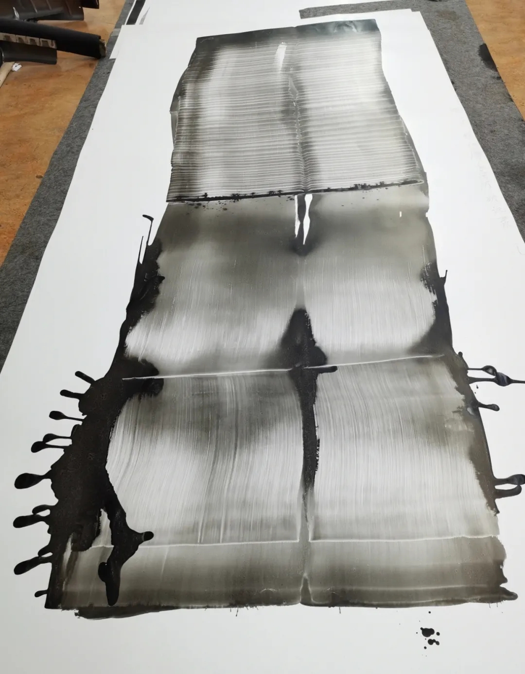 我用不同大小、不同软硬的刮板。实际上是借鉴了我这么多年来对毛笔的熟悉,无非是我刮出来的有方的感觉,这样和我们的现代城市生活更加契合。中国的工业化和现代化正好需要有新的手法去呈现,如果我再强调水墨的传统笔性和宣纸性,很难表达现代人的视觉感受。在这两者的选择之中,我选择表达现代人感受中的块面感觉,当然,这就让传统审美一定程度的衰减,但是从反面来讲,这不正是我所要的东西吗?