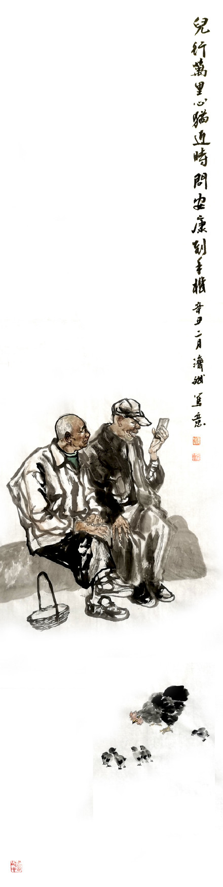 当然,文人画并非每幅都得题诗,题诗也无需整首,一句两句能够说明画意即可。为此,我为谢济斌的图习作代拟题诗时,就只用两句。该图画的是两位赋闲的农村老人,一位开心地看着手机,一位羡慕地旁观,这也是极具时代特色的生活场景,所以代拟两句诗: