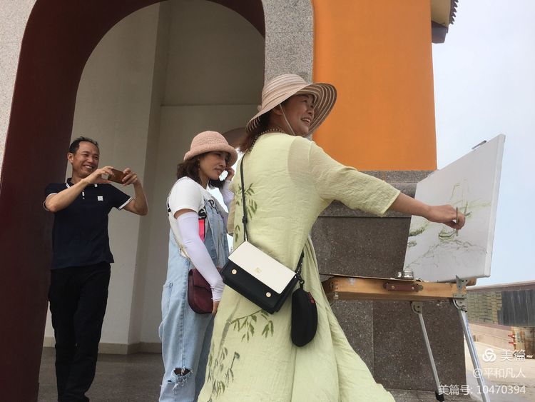 2018年夏天,杨文蓉和叶老师在平和县某宾馆 天台上写生,烈日炎炎下,一老一少汗流夹背,乐此不疲。她还编了一组写生照片发在朋友圈,并调侃道:在阳台上䃼钙。