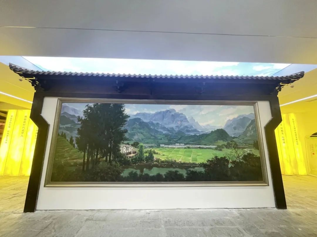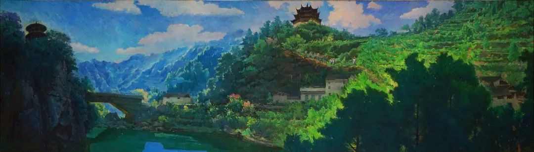 答:画中我以“屏山带水” 结构串联乡村振兴主题:近景的橙树与左侧层层叠叠茶山象征习总书记当年提出大力发展的闽东特色的农作物;纯净碧绿的霍童溪如飘带一样横卧画幅,白鹭群飞寓意着人与自然的和谐生态。枝繁叶茂的深色针叶松衬托着畲民新居,象征生命长青;中景有两个时空,它们通过一座横跨的大桥连接两个九仙村,一个是1989 年 “九仙新村” ,一个是今日“九仙花苑”。画中白色畲民新居使得作品再现1989年习总书记一行人春节慰问畬乡的场景,它是作品的画眼;远景建筑群是九仙畬乡新村---“九仙花苑”和火车站,右边徐徐而行的火车是开往欧洲的中欧班列。最远处之提山云气环绕宛如仙境,也体现出“九仙”这个地方独特地貌。作品核心是通过艺术再现,展现习近平总书记在福建宁德工作期间“四下基层”体察百姓疾苦、千方百计为群众排忧解难的感人故事,传递“牢记嘱托、感恩奋进” 的乡村振兴精神。