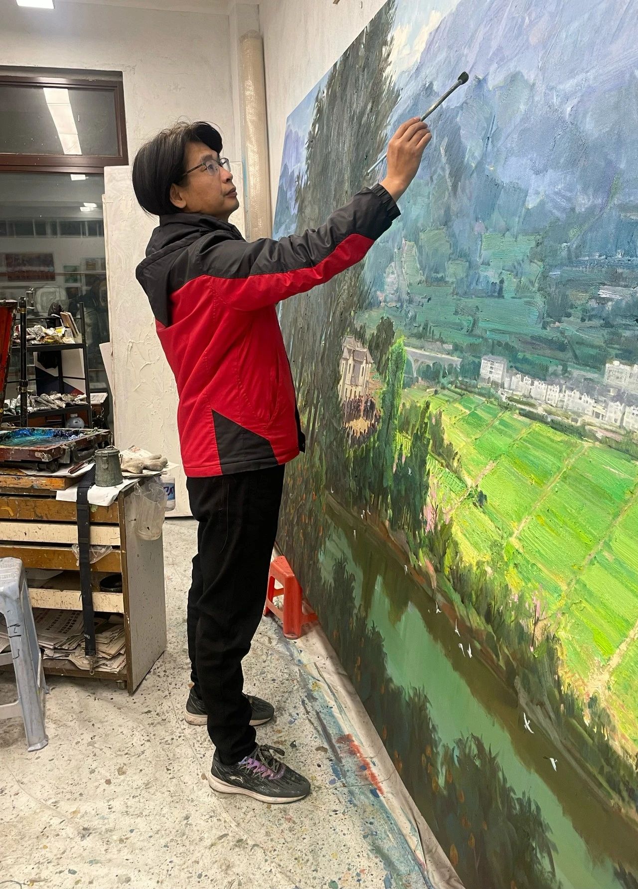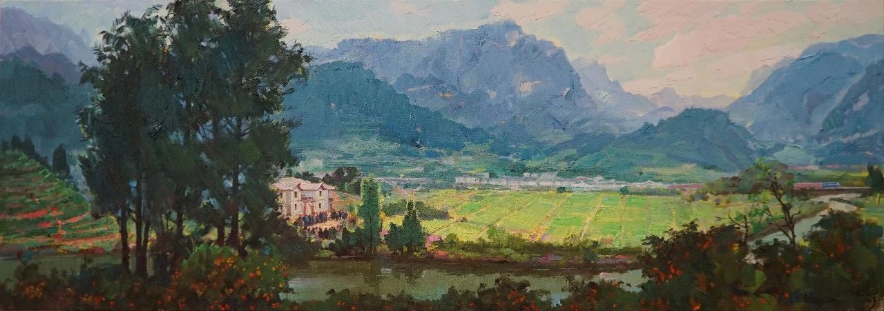 问:《九仙之春》在艺术表现上有哪些独特构思?如何通过视觉元素传递主题? 答:在技法上,我采用浪漫主义与现实主义结合的手法,以舞台布光式的光影交织(如晨曦与午后光线叠加),营造既写实又富有诗意的画面。空间叙事:中景通过大桥连接“历史村落” 与 “现代社区”;象征元素:深色针叶松衬托新居,象征生命长青。画幅中间大面积的绿色田野象征希望,之提山云雾呼应“九仙” 地名的仙境意象;动静结合:水静鹭飞、屋静人走、村静车行、山静云绕,通过细节动态强化画面生机。