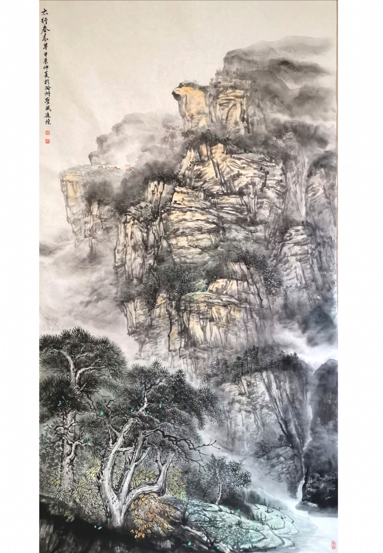 太行的峰峦刻着岁月的叩问。愚公移山的传说,让“王屋太行”成了“坚韧”的符号——远山如黛,山脚添几株老松,枝干虽虬曲,却向峰峦生长,似“子子孙孙无穷匮”的执着;红旗渠的故事,让“悬崖峭壁”成了“奋斗”的注脚——岩间画一线朱红,以焦墨皴出凿痕,让“人工天河”与“自然峰峦”相依,如历史与山的对话。峰峦是“碑”,记忆是“文”,画中不必直白叙事,却让观者从岩的“古”与痕的“新”里,听见“前人栽树,后人乘凉”的历史回响。
