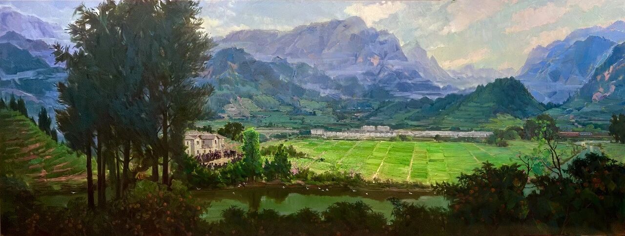 中国画在我的油画创作上的融合具体体现在以下几点:构图上,我会结合移动的平行透视和散点透视的构图表现方法,来表现一些较为宏大叙事和大型场面的主题创作。在场景的处理上,我会采用更为写意的表现手法,以增强画面的意境和氛围。在色彩运用上,我有时会为了追求画面的整体氛围和意境而适当减弱色彩的强烈对比,强调整体画面的意象表达。在笔触的语言上,我会更加注重书写感和写意的笔触,强调用笔的韵味和干湿厚薄的变化。