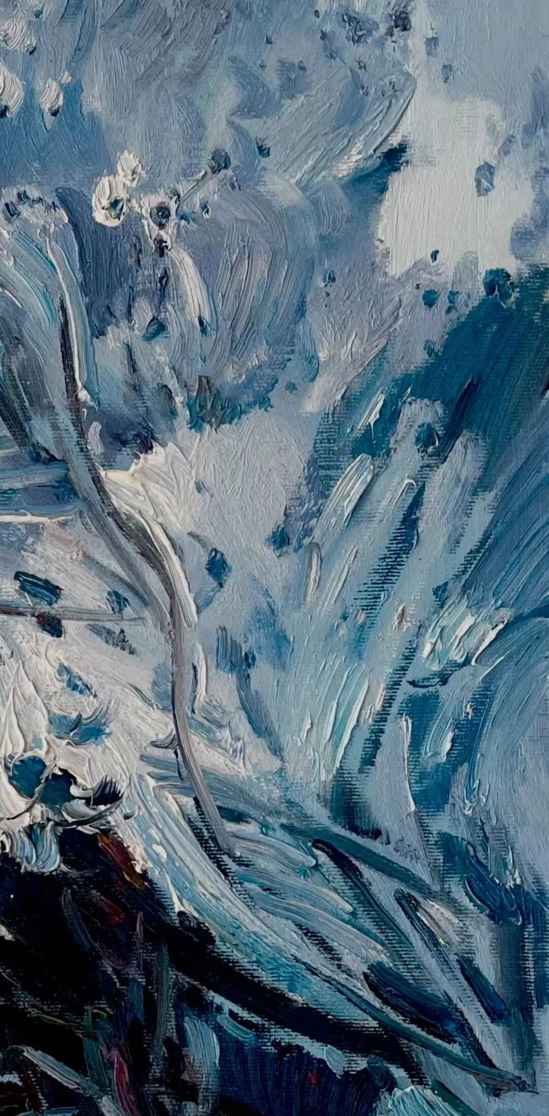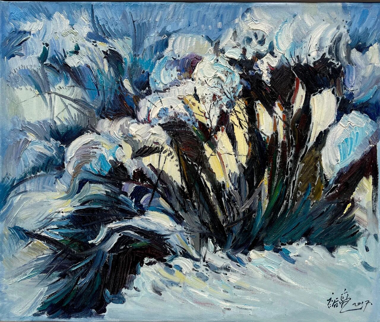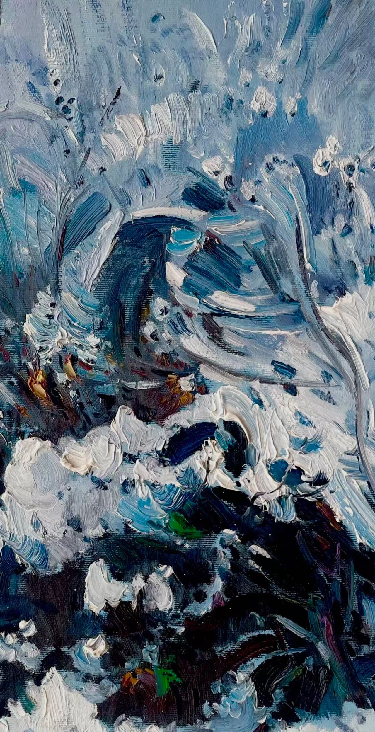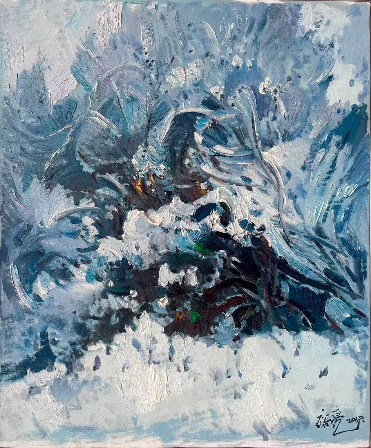 作品构图独具巧思,形似孔雀开屏,以羽毛般舒展的笔触将雪景铺陈开来。这份构图设计,既化解了宏大雪景难以具象表达的难题,更暗含着南方人初见雪景时的激动与欣喜。