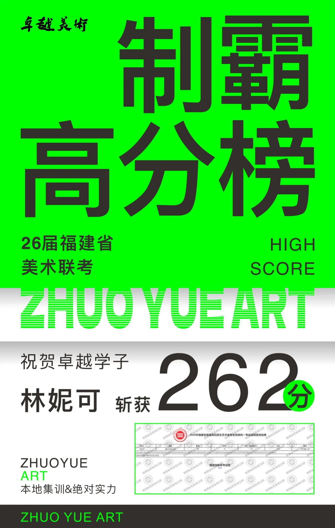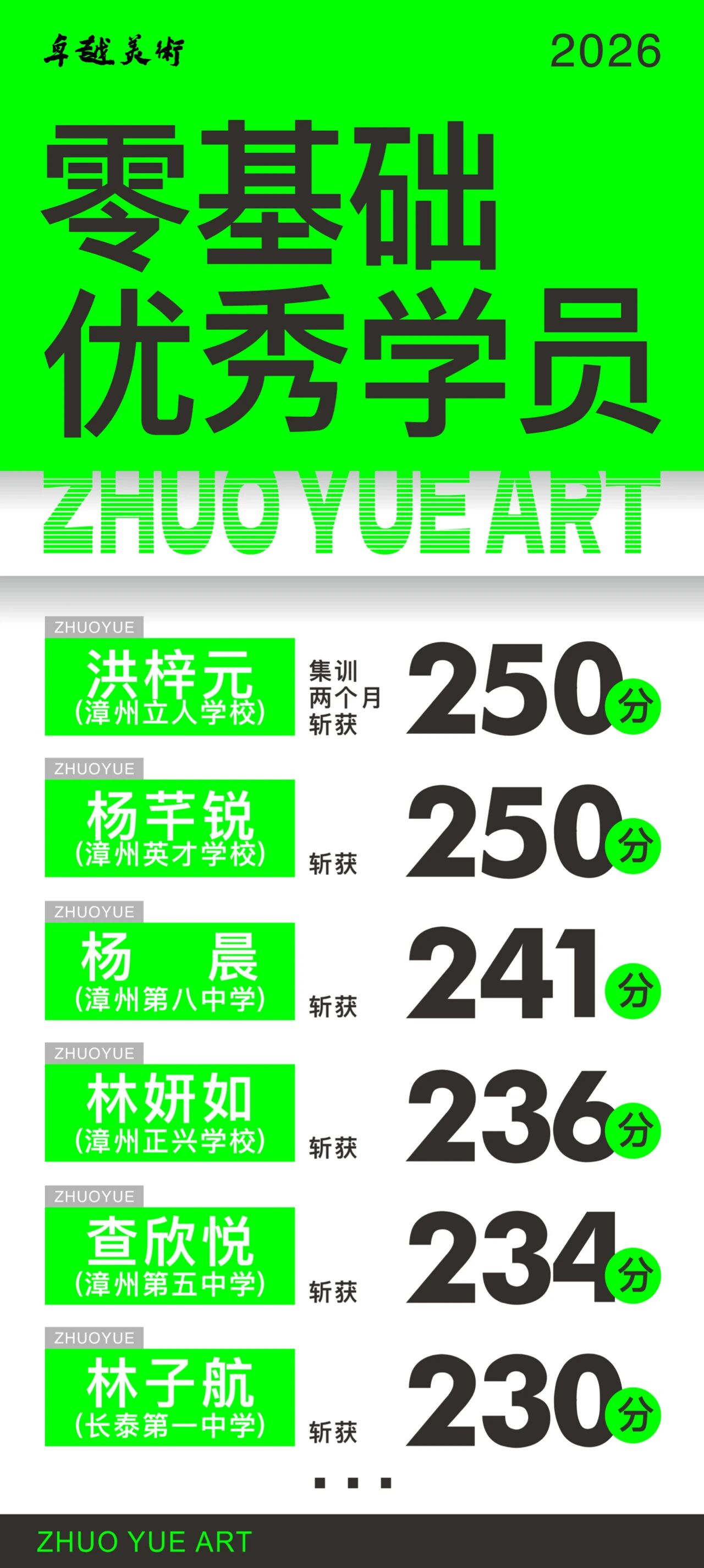 卓越美术,漳州美术高考第一品牌,扎根漳州本土16年,屡获佳绩。     卓越美术携手南风艺术强强联合,成立南风艺术卓越校区,始终保持初心,不断深耕教学,在全体师生的共同努力下,2026届联考成绩打出了致胜王炸,卓越学子张佳怡、林妮可并列全省第11名,上260分2人,上250分8人,速写90分以上2人等优异成绩;其中更有零基础参加集训并获得不错成绩:来自漳州立人学校洪梓元仅集训2个月考取250分;来自漳州英才学校杨芊锐考取250分;来自漳州八中杨晨考取241分等。面临全省1.2万人考生的激烈竞争,这份成绩来之不易,更是我们教学实力与学子努力的最好证明。     从2026届开始漳州籍考生,美术联考考点就在漳州市区,做为漳州籍的艺考学子更无需离乡、花更多的费用到外地奔波,而放弃本地优质资源和便捷性,卓越美术具有本地集训主场优势,能为广大学子提供更加优质的教学和服务,下一个黑马就是你,欢迎加入我们的卓越大家庭