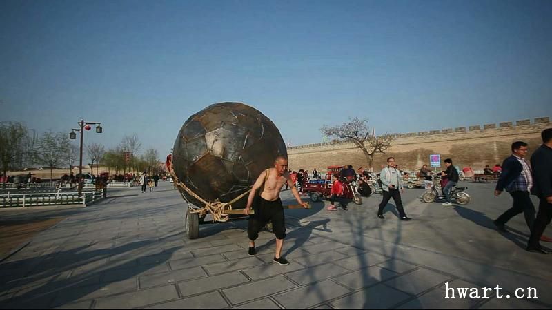 镀金的铁球或是象征着金钱至上的拜物主义。物欲横流的社会现实反映的是人们信仰缺失,灵魂沉沦的精神惨景。朱新战或许是想通过拖“金球”这个行为唤醒大众:无限地追求金钱物质是荒唐的。