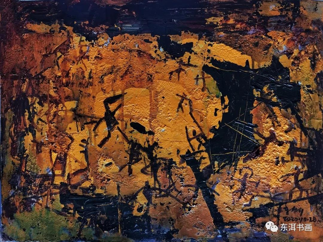 而对空白的画面,我没有成竹在胸的从容和老成,我只有儿童般毫无顾忌的涂鸦,留下一片发自内心的痕迹,而后面对这片“污迹",我又陷入了苦苦的思索,把画面一点一点地完整成我想要的那种痕迹。这是我的创作。