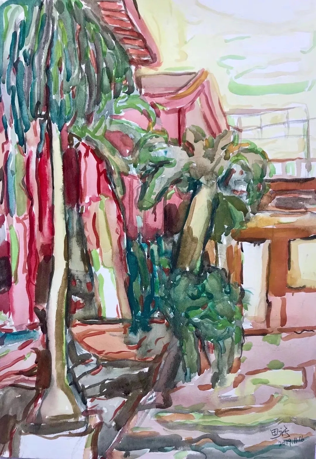 从威尼斯回国第二天,我还处在倒时差的迷糊状态,厦门水彩画家再次组织周末去写生。我从群里看到胡思旗的四幅水彩作品,色彩明快,线条轻松,使我迷糊状态一下子清醒过来,眼前一亮,心有所感,他的作品闪烁着德国批评家本雅明分析古典作品时提到作品应有的灵光。