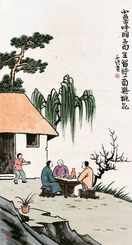 梅竹与松合称“岁寒三友”,按原诗以它们入画,春天气息不浓,草未全绿,所以丰子恺将它们改为柳树。人物照样穿着民国时装,时代特征很明显,比画成古装人物通俗性强得多,因而既是“漫画”,也可看作风俗画。这种与时俱进的创作,是丰子恺漫画的重要特色与学术价值。