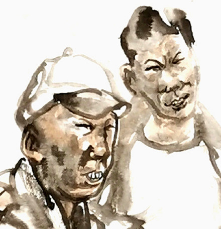 农民工的题诗,立意乐观,那是考虑到当今社会提倡“正能量”,但原画那位年轻点的农民工脸容明显有些忧郁,在其映衬下,较老的那位咧嘴眯眼就不是笑意,而是艳阳下脸部肌肉的条件反射,为此我原本拟题如下一诗: