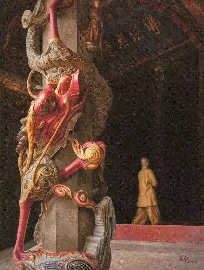 画家在创作这些作品时不拘泥于成法,以自己对家乡的深爱和眷恋的情怀,打破写实与写意的界限,实中有意、意中见笔,并利用光影的反差和色彩的对比来传达作者内心情感主题。抓住瞬间的美景和宁静的片刻,大胆构图,变换视角,甚至打破透视的限制,以寻求一种震撼心灵、感悟生命的艺术效果。