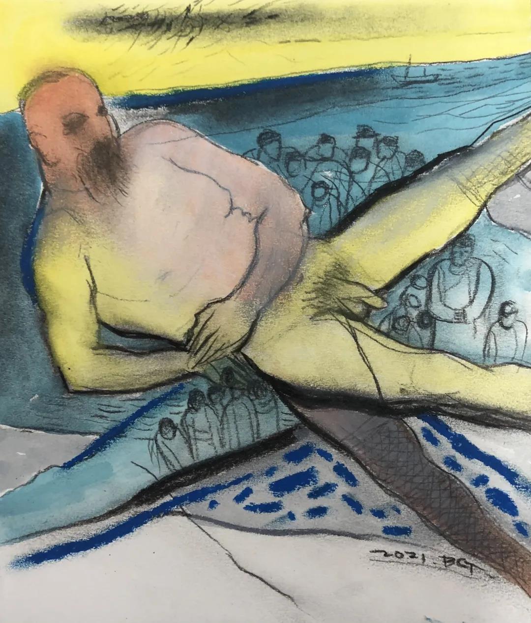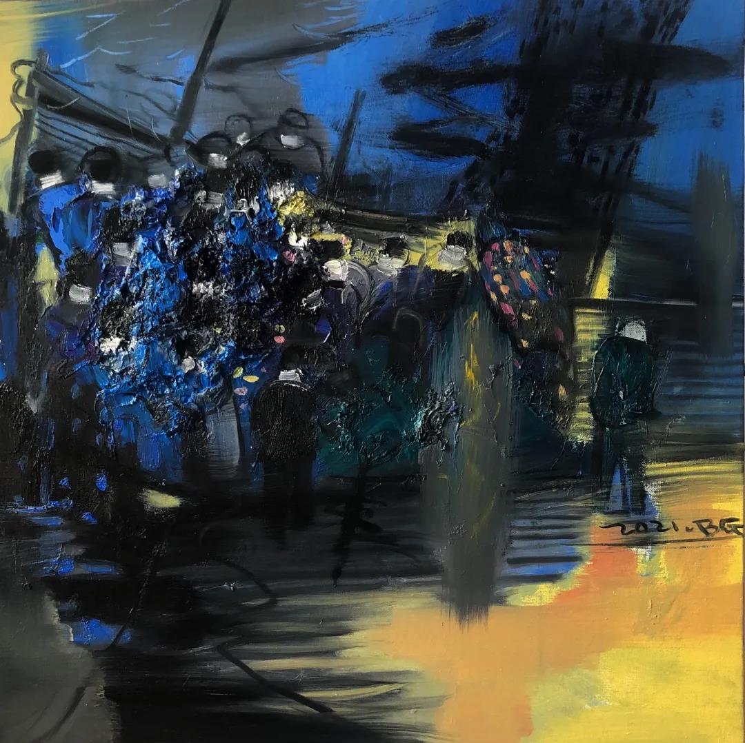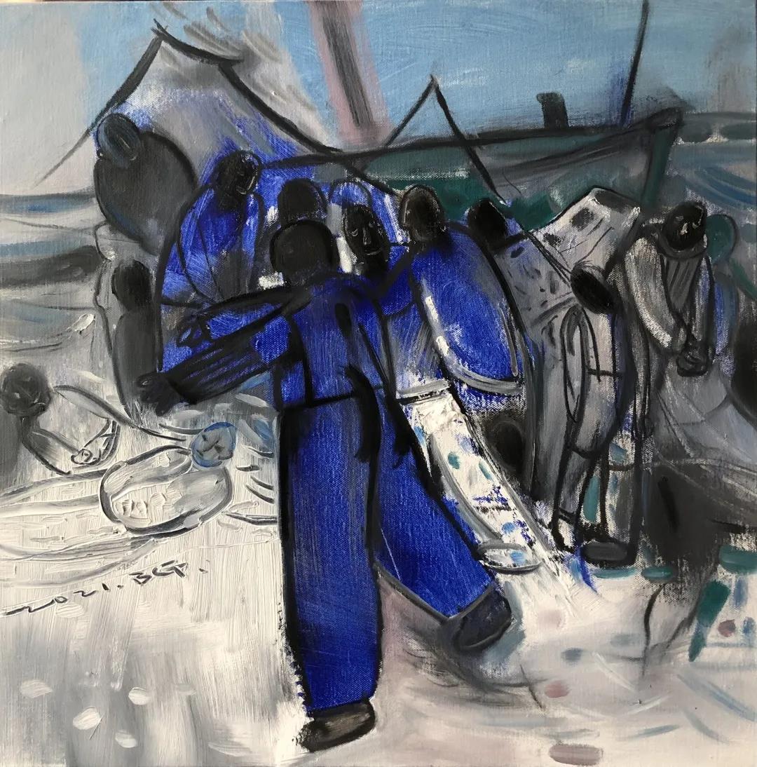 没错,斑驳破旧的渔船还在出海捕钓,港口夜晚的渔火依旧星星闪烁。人影憧憧,男女错杂,时空叠加,意象繁复。说穿了,现实中根本不存在这样的场景,这是虚构编造,是作者的胡思乱想。可奇怪了,土著如我却不由自主地被带入,恍若白日梦,仿佛回到从前,又分明就是当前。能看到画面散发的烟火气,能感觉到人群的体温,以及欣喜、兴奋、平静、惆怅、困惑的情绪传递。生命活力无法编造,莫非这都是“写生”?艺术的主旋律永远是离经叛道,不同于生活,有它自己的真实。看似的不存在,并不意味着不可能。只有对现实进行超越和重塑,才能满足艺术家“说梦”的欲望。