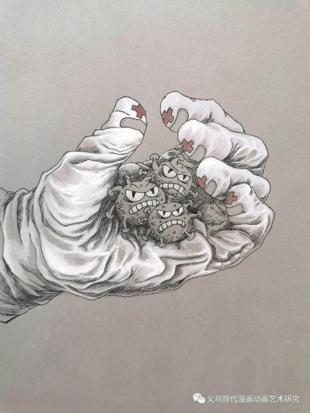 这些作品中,有把医护人员想象夸张而成的巨手《病毒难逃》;有温情催泪的《爸爸,我等你早日凯旋》;还有全家宅家时的幽默场景系列《宅家乐》等。
