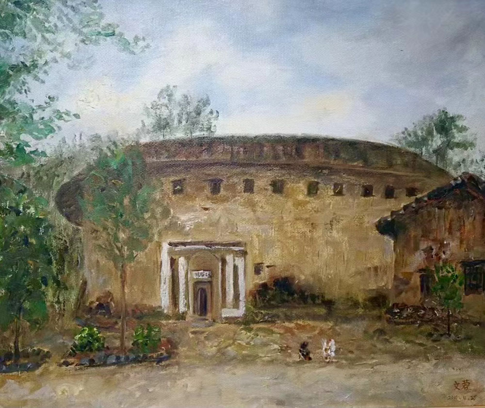 认识杨文蓉是在2015年的秋季。一天,我正和我老师、油画家叶老师在平和五寨的“寨河土楼”里写生。平和南胜镇二位年轻艺友闻讯赶来,静静地看着我和老师在写生,没有说一句话,就这样静静的站着、看着,直到我和老师歇息下来,才和他们搭上话,才知道他们也喜欢绘画,而且其中一位也涉及油画艺术好些年,这位油画同道艺友就是静静的、沉默寡言的杨文蓉。一小时后,他们有事告辞,临别之际,我赠给杨文蓉一本我的版画作品集。