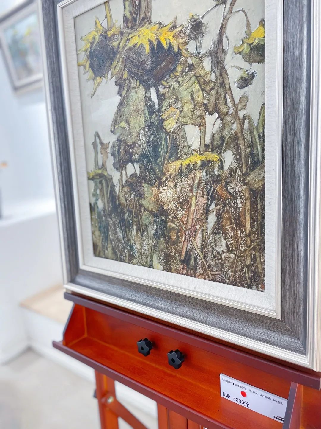 “我被这张《红土地》打动,大概就是几秒钟的事情:葵花盘和叶子都无精打采地耷拉着,但我感受到的,不是衰败,而是干燥的高温,有一股热浪扑面而来。一缕金色从低垂的葵花盘中流向地面,融化了一般。在这色彩清素的画面中,竟然感到一股热浪,意外而惊喜。短暂的凝视之后,《红土地》成了我收藏的第一幅油画作品。”