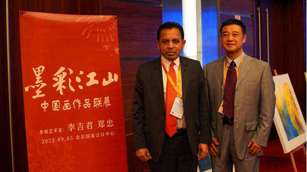 大会嘉宾斯里兰卡驻华大使帕利塔.科霍纳参观郑忠作品后与之交流,盛赞中国水墨画的奇妙感染力。
