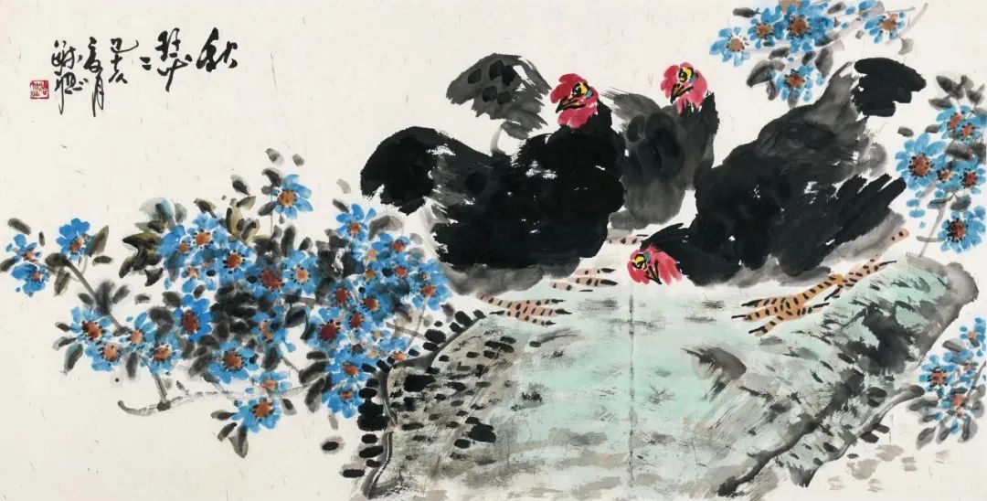 其艺术博综集粹,渊源广大,由近现代之吴昌硕、齐白石、潘天寿诸巨匠,追溯至扬州八怪、八大山人、青藤白阳,悉为己用,蔚为一家。