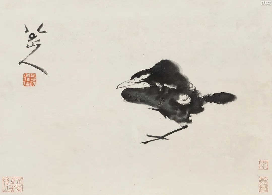 谈到“情绪鸟”,必然会想到八大山人朱耷的花鸟画,里面常常出现一只眼神忧郁的小鸟,这些鸟要么“白眼向天”,要么“低头闭眼”,眼神中总是充满忧郁、孤寂的复杂情感,那只孤冷清高的小鸟就是末代王侯朱耷自身的写照。