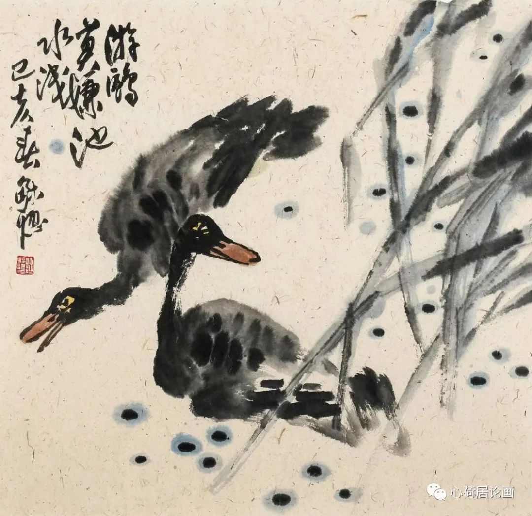 其艺术博综集粹,渊源广大,由近现代之吴昌硕、齐白石、潘天寿诸巨匠,追溯至扬州八怪、八大山人、青藤白阳,悉为己用,蔚为一家。