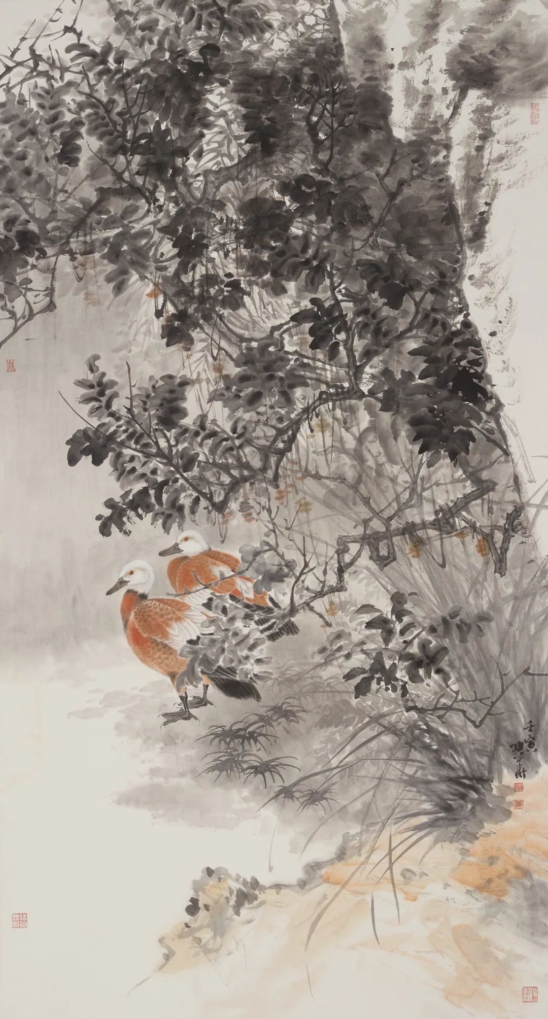 其用笔更是苍劲有力,纵笔挥写的芦竹蒲草、精细干练的鸟毛勾勒,都体现出了豪放大气的写意精神与注重细节的传统技法的完美融合。顿挫变化、转折呼应的笔势,结合有虚有实、浓淡相宜的墨色,使得画作豪放之中见法度,细微之间显精神。