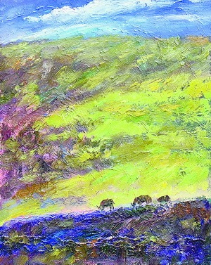 《一带一路·望昆仑》系列是林文德倾注一腔热忱创作的。他多次奔波于帕米尔高原,昆仑山上白雪皑皑,山下牛羊满山坡,斜阳映照下的村庄炊烟袅袅,羊群围绕着村舍……这些风光打动着林文德,激发他的创作灵感,最终浓缩为一幅幅油画。