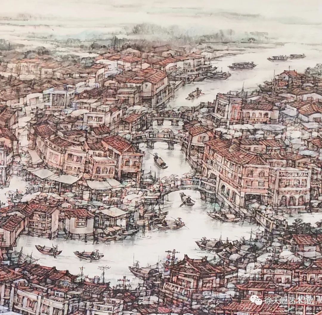 学仕根据童年时期的涵江地理位置特点进行构图,以咸草顶三角埕为中心,把不同区域不同年代的地标性建筑串在一起,全面反映农耕时期商贸重镇的真实面貌,表现出享有“小上海”盛誉的繁荣景象。在创作过程中,作者不是单纯地对景物生搬硬套, 而是根据画面的需要,借用水系穿插变化,丰富画面的生动性,通过红砖厝的表现形式,强化古镇的地域符号,体现出作者既强调作品的文史价值,也突出作品的艺术价值的良苦用心。