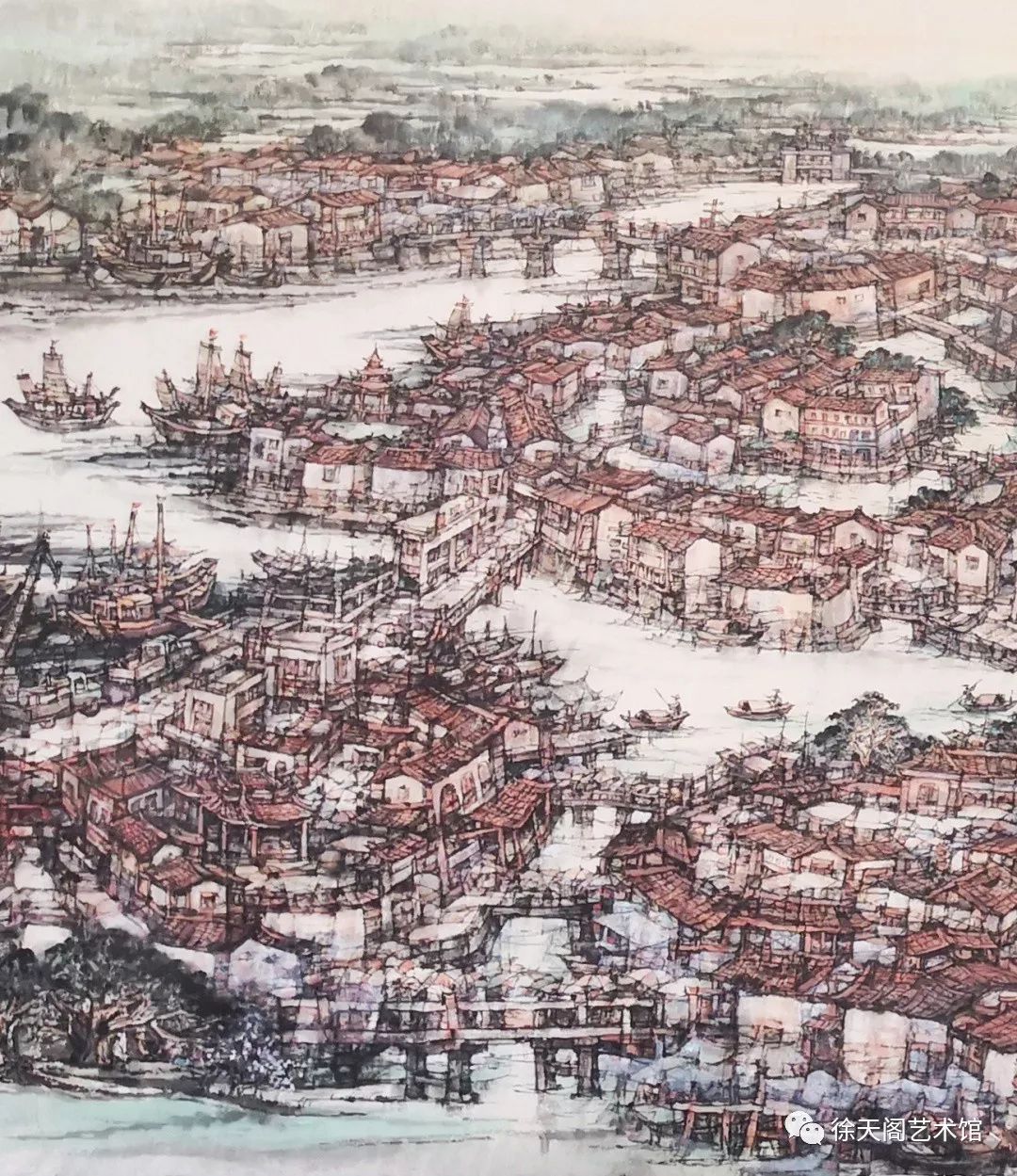 近日,学仕发来他的新作《涵江古镇全景图》,我认真读了一遍,心中为之一振。这幅国画以红砖厝为主题表现涵江昔日繁荣的大街小巷,以河流为主线表现繁忙的水上交通,此情此景仿佛让我们这一代涵江人一下子回到当年的古镇语境中。