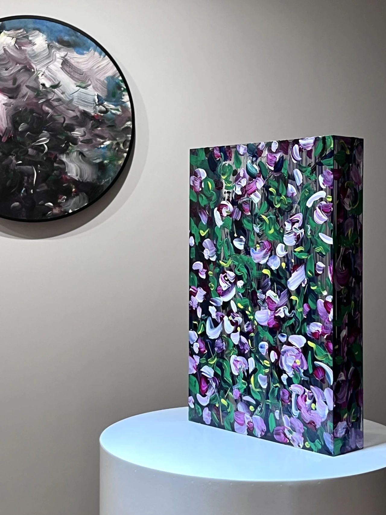 他永远都在尝试新的方式与媒介。他开始尝试直接在透明亚克力上作画。光滑与透明给他带来新的触觉与视觉感受,激励他用不同于布画油画的手法去涂抹、去刮蹭。他取消了画面的透视与立体法则,因为他意识到材质的透明性本身就是对立体的反动,为什么要将通透覆盖掉?为什么不能把通透作为画面的一部分而存在。通透与光影将会重构出新的画面,且随着光影的变化而变化。