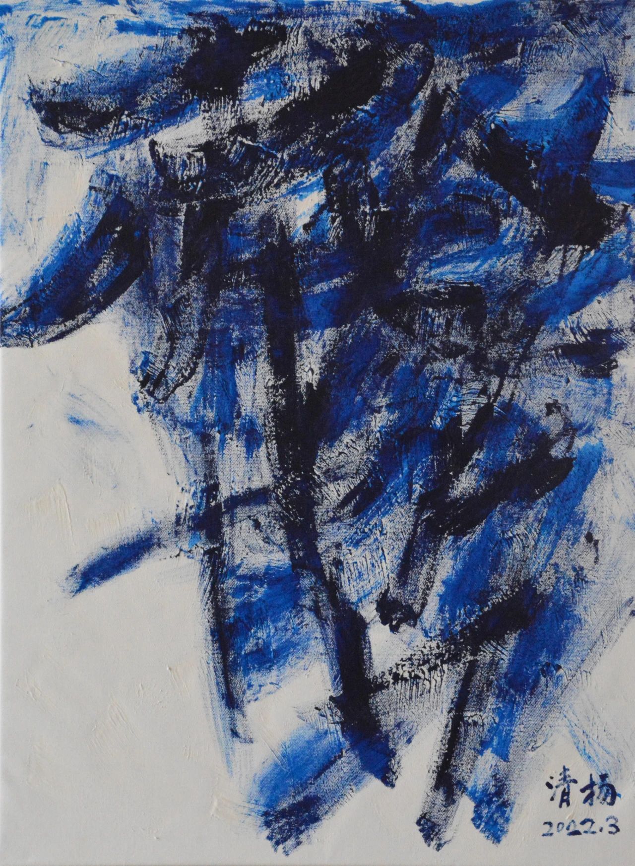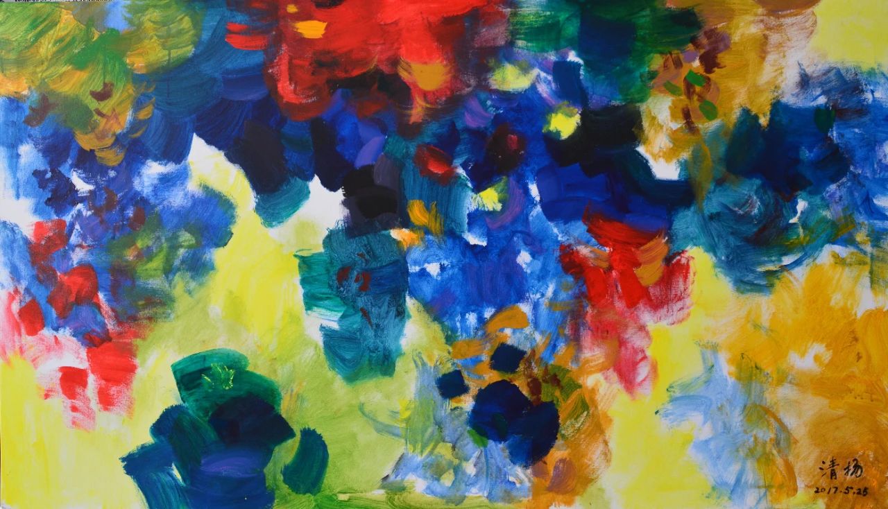 答:我的抽象画以水彩抽象和丙烯抽象为主。原来我画水墨抽象,1999年夏天,看到我国水彩画家宁泓麟老师画一幅水彩风景画,被水与色的交融所吸引。当时我正研究抽象,想丙烯和水彩道理是一样的,抽象一定效果不错,就试了试。在水的作用下,颜色出现了神奇的效果。不过,感觉很难控制画面。从画面湿水到画面干燥,只有7、8分钟的时间。在这么短的时间内要考虑构图、色彩搭配、黑白灰、笔触与肌理,难度极大。通过反复试验,掌握了一定的技巧。