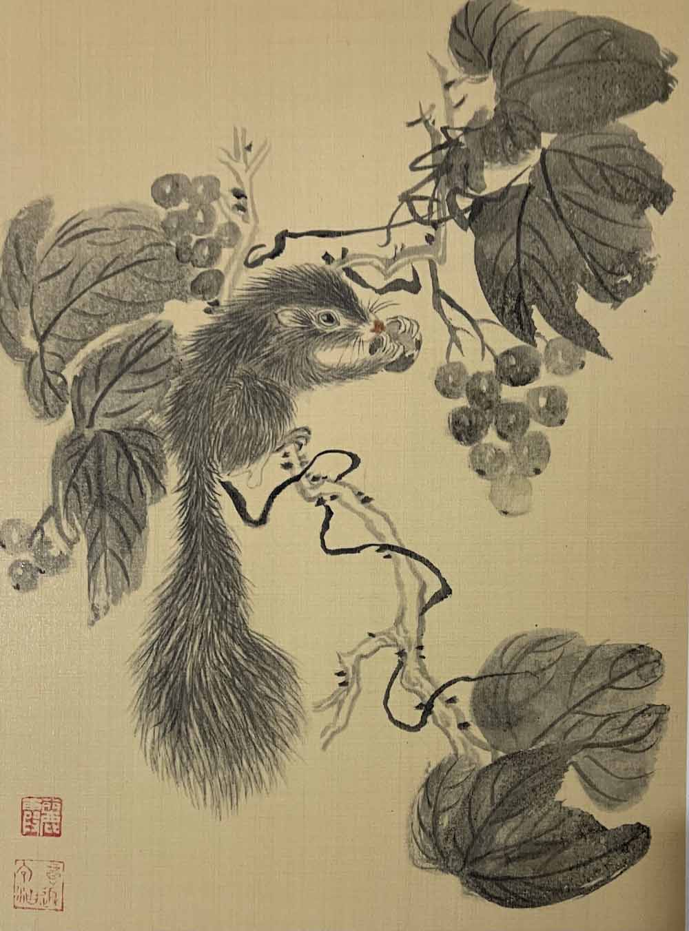 画灵动之物:以飞白写松鼠,迅疾墨线勾飞鸟,求笔未至而意已达;