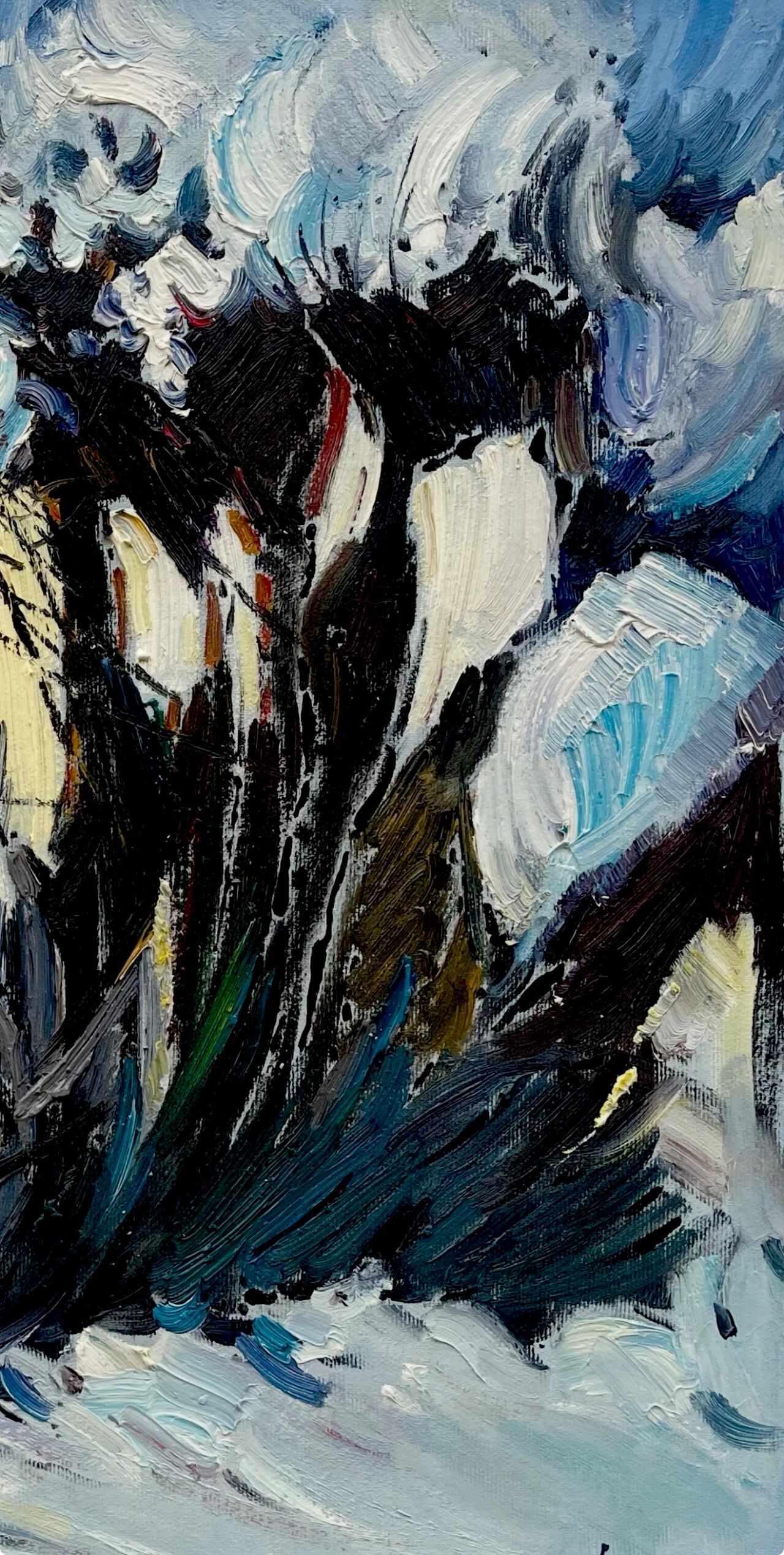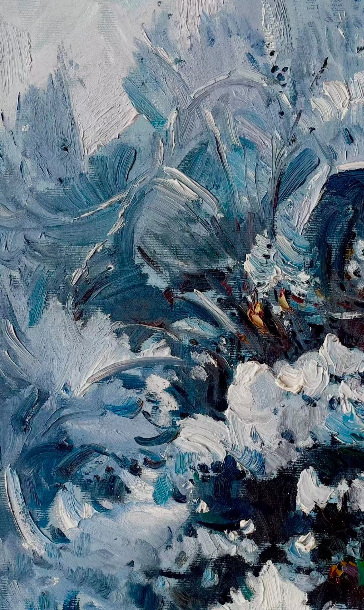作品构图独具巧思,形似孔雀开屏,以羽毛般舒展的笔触将雪景铺陈开来。这份构图设计,既化解了宏大雪景难以具象表达的难题,更暗含着南方人初见雪景时的激动与欣喜。