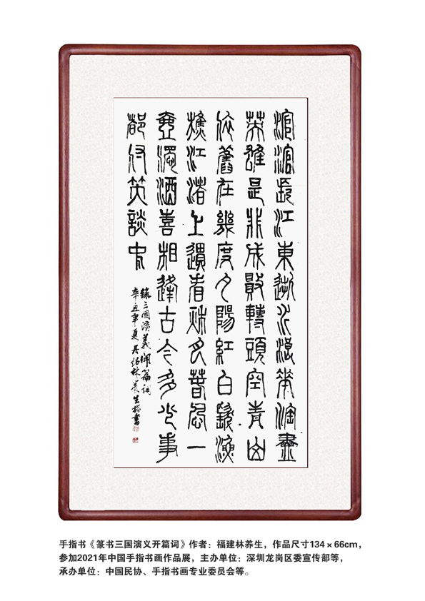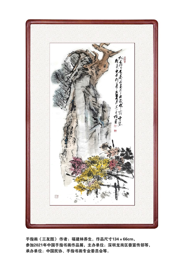 在福建地区,指墨艺术的发展尤具地域文化特色。福建山海相依,人文荟萃,书画传统源远流长。在这一文化土壤之中,指墨艺术逐渐形成具有地方气质的发展传统。福建省文史研究馆馆员林养生,正是当代活跃于这一艺术领域的重要实践者之一。他以深厚的文史修养为根基,在继承传统指墨艺术精神的同时融入个人审美经验,使其作品既见古法,又具时代气象。