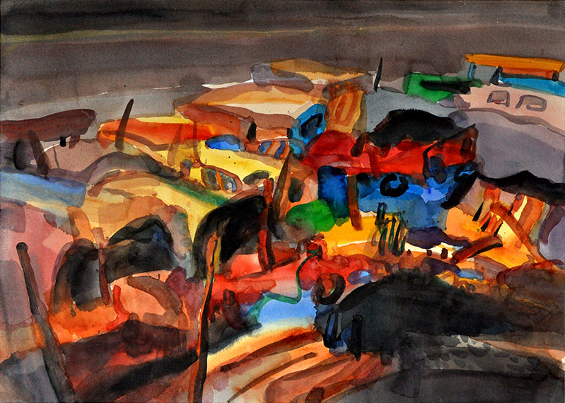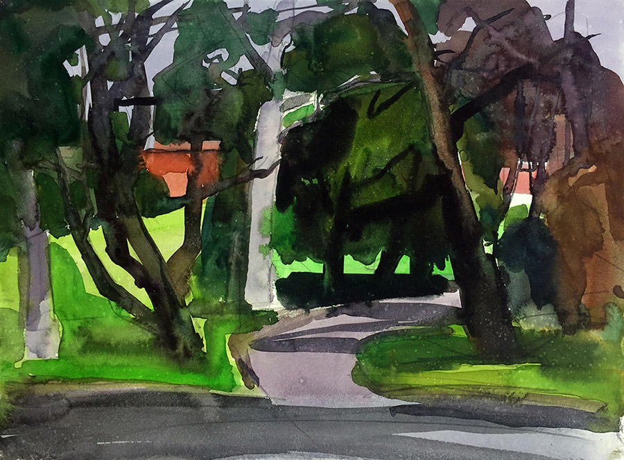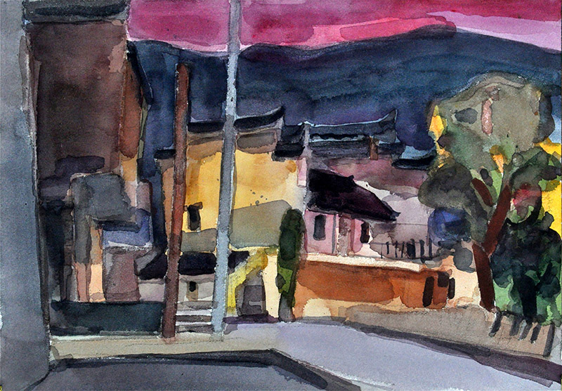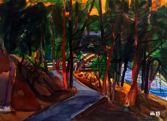 假如有过面对普通风景写生的经历,会羡慕林天喜可以将很普通风景画得生动的能力,当然不必相信他背后有神灵相助说法,但能够化腐朽为神奇的能力却是值得思考。仔细分析画面会发现他总是将观察的色彩夸张到最高程度,不管是鲜艳的色彩还是黑暗的色调,都被处理成最强的程度,风景中松散的形体被他处理成有序的、有松有紧的形体关系,线条也是被概括成具有绘画感的书写。以此,可以感受到他所有的形、色、线的处理,都具有胸有成竹的“规定”,甚至以“规定”去超越写生必须的观察。