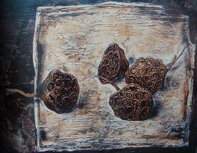 《四个莲蓬》32x25cm 漆画 2002年作