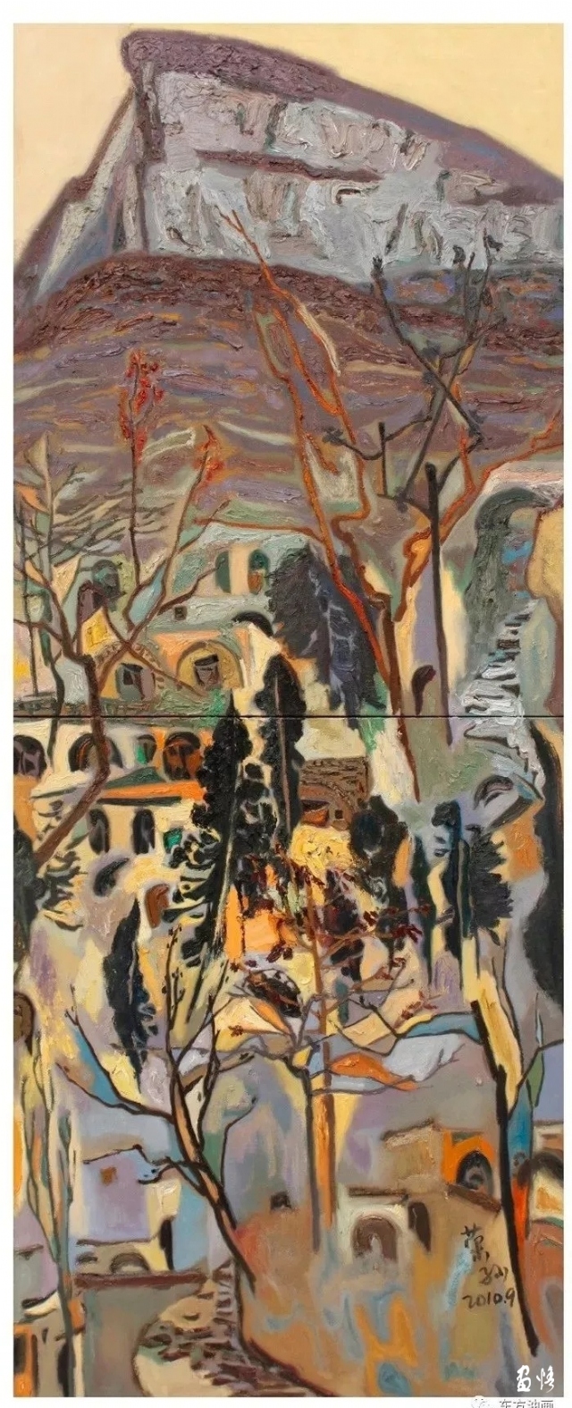 在造型处理上,所画出的形象要真实可信,有自然原型,但并非照抄照描自然物象。将客观的自然变成胸中自然,把胸中自然变成画布上的自然,注意“神遇”、“迹化”的过程。将自然形象转化为具体的绘画语言,少些物象的概念,多些绘画语言自身的抽象性元素,同时被转化为绘画语言的形象又必须有自然物象本身的特点。让每个形既生动自然又各富特征,表达出最有意思的东西。尽量让每个形会说话,物象与物象之间有交流。在具体形象组织上,从局部到整体都要注意画面关系的需要,如窑洞的处理,是根据山树之间的关系,将窑洞安排其间,每个窑洞都是具体的,大小、形状、虚实同样根据画面节奏而定。以窑洞为主强调窑洞弱化整个房子的感觉,房子的结构是被肢解后再重新组织的,这点上吸收立体派的一些造型原理,使得画面具有些现代造型的元素。在用笔造型上,追求形、色、笔触、肌理相结合。尽量用写的方式,注意占色的次序,颜料尽量少的放在调色板上调和,尽可能在一笔画下去让色彩丰富而且和形结合,运笔或快或慢,颜色或厚或薄都力求一次完成。
