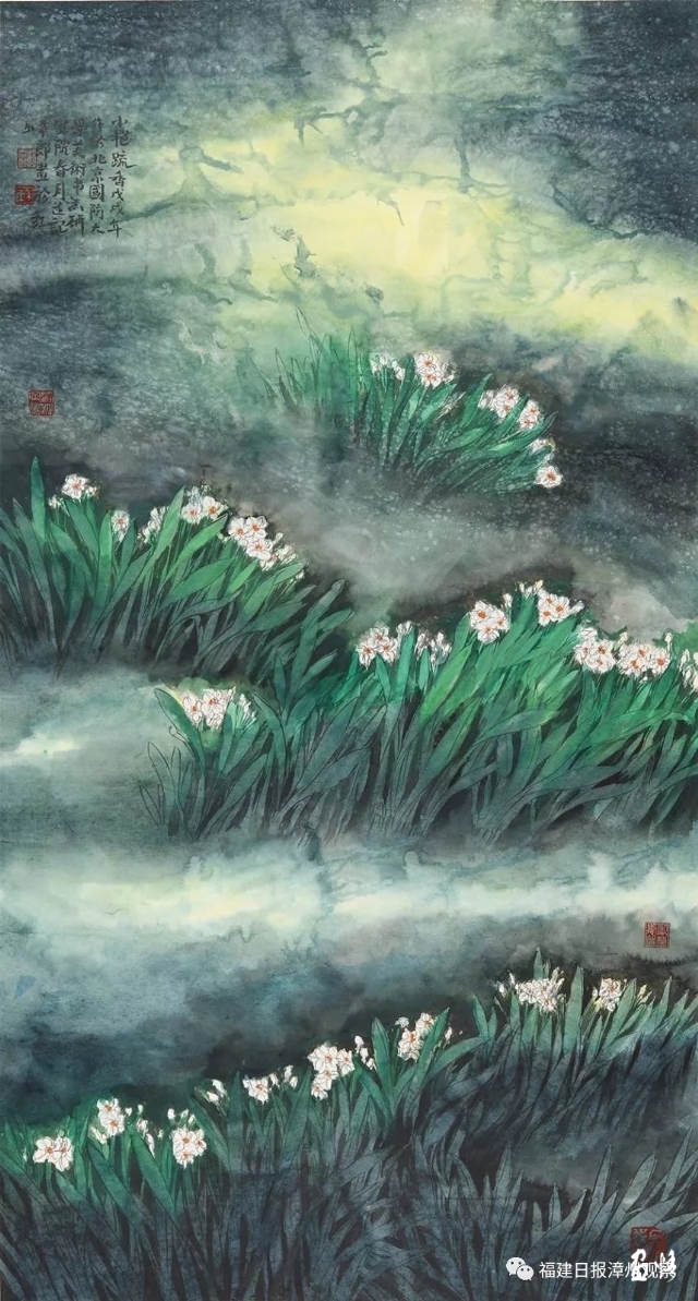 “水仙花在温暖的春风中开了,它虽然没有牡丹的娇贵,也没有腊梅的清香醉人。但它有自己独特的风韵。”4月10日,得知漳州籍画家杨幸郎返回家乡,创作水仙花主题国画,记者前往探访。