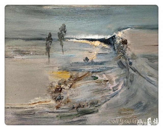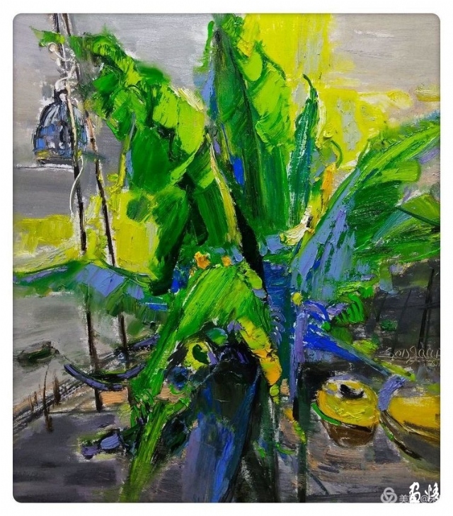 极具特色的画室、展厅与长廊,仿佛把一切都准备好了,迎接着我们这些远道而来,为了心中那份执念而钟爱艺术的朋友。展厅的作品,与这山这水交相辉映。一幅幅深沉含蓄,充满真情的作品,让我的思绪随着画面的音律、节奏、延伸跳跃。一幅6米x1,8米的睡莲,抓住了我的视线。如此大的画面,整体把控如此之好令人敬佩。画面结构严谨,疏密有序,用笔繁而不乱。杜老师仿佛是一位歌者,一个个小小的笔触好似一串串小小的音符,以其特有的表现形式,呈现着它的美感。这些元素柔美地缱绻在一起,有节律地弹拨着一首动人心弦的《睡莲曲》。