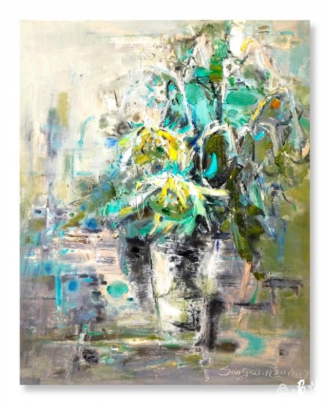 流动的黄被深沉的绿拥着,浓郁而热烈。那些随风翻滚着的深褐色的葵头,使得这片葵园更富有色彩感。它们很美,美的生动而灿烂。支好画箱,挤好颜色,雪白的画布上便涌出了流畅的线条,手中的扇形笔和着音乐随心写意,似要揪出内心的感动,在画布上构建着葵的世界。心情也被感动着,变得深情而朗润起来。
