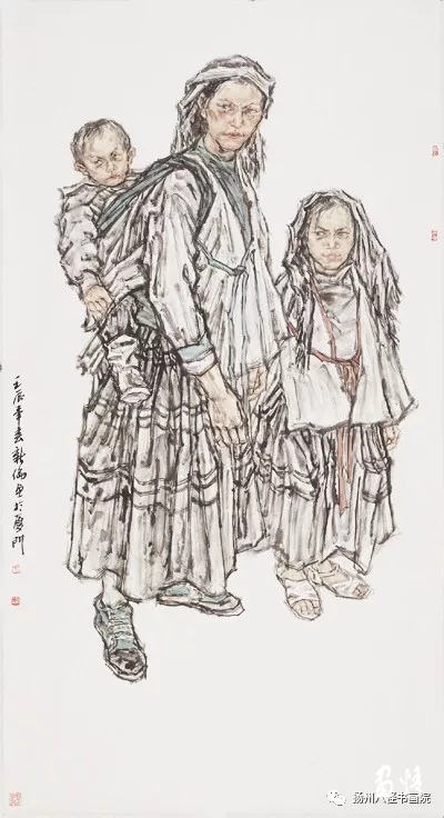 我在为艺术家作评时,总想挑出点毛病,对读者有个交待。然而,面对王新伦的作品,我不知如何去挑。虽然我也感觉到有些地方随衣纹的笔墨皴擦的扭曲圆转线条过多,失之自然,“做”的感觉多了点,可是,从其作品自身语言表达意图的任务来讲,正因为王新伦的作品能够较好地表达他的所思所想、所爱所感,并借此感动观众,因此,可以说王新伦的作品是自足完备的,是充满当代表现主义情怀的佳作,我们已经无法用传统文人画的笔墨品味来衡量和要求王新伦了。