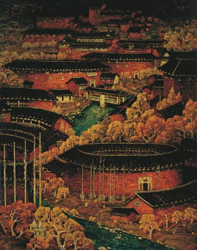 周榕清的漆画创作,约共经历三个阶段。1993年至2005年,他重在表现对故乡土楼的乡愁、依恋。比如《红柜子》,通过一个红柜子及其他厨房用品、蔬果,展现土楼厨房的一角,营造了一个淳朴、温馨、诗意的土楼人家。《土楼秋色》中,艳丽的秋阳下,一条溪涧沿着或方或圆的土楼群蜿蜒而过,红墙黑瓦、红色夯土、秋树流光,仿佛将人带入一个绚烂又静美的天外世界。构图上,厚重、雄浑、气势磅礡。