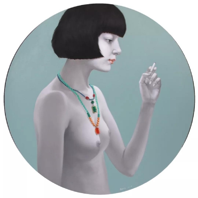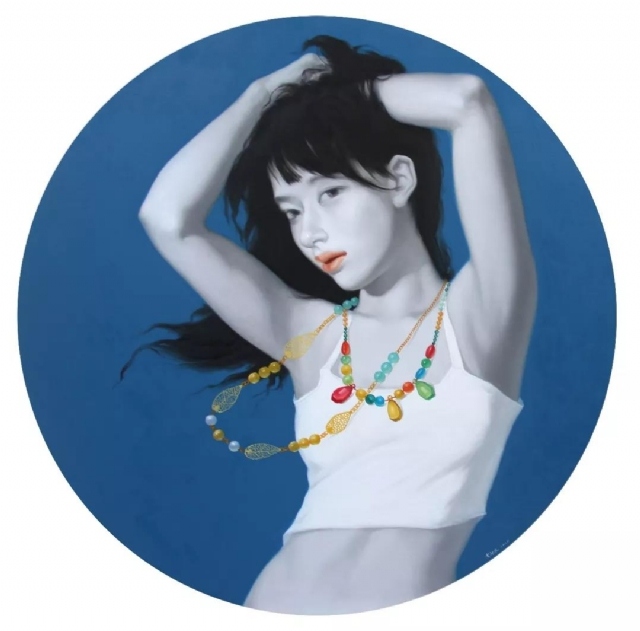 在这一蓝版系列作品里,蓝色她是幻想积极的一面,她象征着乌托邦式的遥远。蓝色她来自于遥不可及的天空,把蓝色从天上骗下来,置于画面与银灰色的人物相伴,在现代工业社会里银灰色是一种冰冷的金属物,而在没有时限的颜色里,一种宁静的冷艳,让我们之间产生一种隔着空气的距离感。