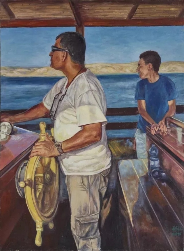 下面这幅画是大家来到加利利的湖上,跟随渔船在湖上观光。人们想起《马可福音》中的话“1:16 耶稣顺着加利利的海边走,看见西门和西门的兄弟安得烈在海里撒网,他们本是打鱼的。可1:17 耶稣对他们说:“来跟从我!我要叫你们得人如得鱼一样。”可1:18 他们就立刻舍了网,跟从了他。”