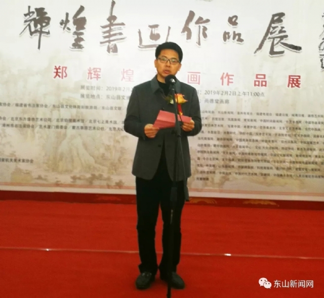 开幕式上,县委常委、宣传部长李斌代表县委、县政府对辉煌书画作品展的举办表示祝贺,他指出:春节期间,举办辉煌书画作品展的主要目的是倡导和鼓励文艺工作者深入基层第一线体验生活,发现新事物,用自己手中的笔墨书写描绘新生活,讴歌新时代,以此推动东山县文化的大繁荣、大发展。