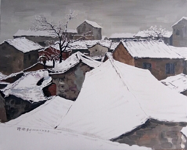 由于室外写生受光线变化影响,每天只能画半天,于是这张大画一连奋战三个下午终于完成,完成之后腿上已被蚊虫叮咬近乎麻木。但辛勤付出总是会有相应回报,此张作品送选浙江省美术家协会、浙江省油画家协会联合举办的“2015融合与拓展·浙江省油画作品展”入选并获优秀作品奖(此次所有获奖作品均未分名次)