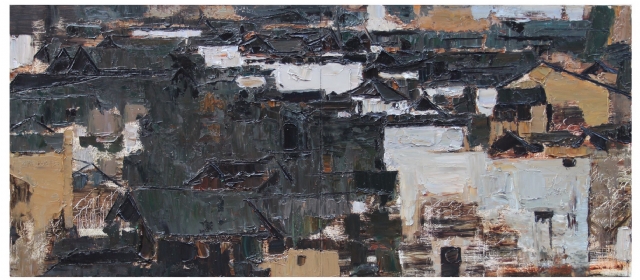 杨荣孙 《古村》油画 2015 70x160cm 杨荣孙,男,1970年生于福建省浦城县。1992年毕业于武夷学院美术系。2002-2005年在厦门大学油画系进修。2009-2011年就读于中国人民大学艺术学院研究生主要课程班(油画)。2011--2013年就读于中央美术学院中国壁画学会联办、第三届壁画高级研修班。中国美术家协会会员,中国壁画学会会员。