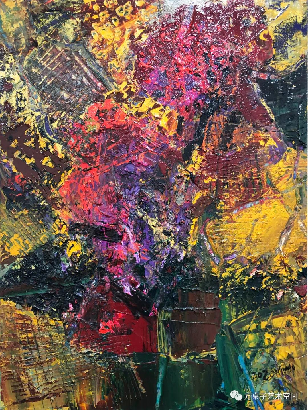 看明华的画,首先映入视野的,是经由自然物像借势而来的抽象的框架结构。将繁杂缤纷的自然景象进行整合提炼和强化。浓郁、厚重、强烈的色彩和画面效果。显示出他对画面的把控能力和绘画上的主动性。而他的作品不论大画小画都有一种大气磅礴的气势,和格调不俗的品质。这种气势首先来自他笔意的书写性与意象境界的表达;格调则来自对绘画本身问题的探索,而非拘泥于对自然的描摹再现。他的《船》系列间于具象与意象的表现,很震撼,看后有一种挥之不去的神秘甚至恐惧的感觉!而植物系列则灿烂茁壮,生机盎然,又是一番天地。