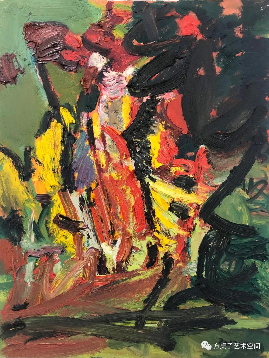 酒后继续喝茶、说话。明华让我看他近期的画作,明华的勤奋我深有体会。但这些近作还是让我吃惊,他那旺盛的创作热情不能不让人叹服;短短的两三个月的时间,他创作了一批的大画小画,堆满了这个新的工作室。也许他把自己在这疫期之中那份难言的郁闷、窒息和其他的情感,悉数倾倒在画布上;而人和人之间的隔离,他就用颜料和自己进行对话。聊天中我突然萌生让他办展的想法,然而,明华对展览是不上心的,他从来、也更多沉醉于绘画过程给他带来的那份快感。于是免不了我的几番说服,终于有了这次的展事。