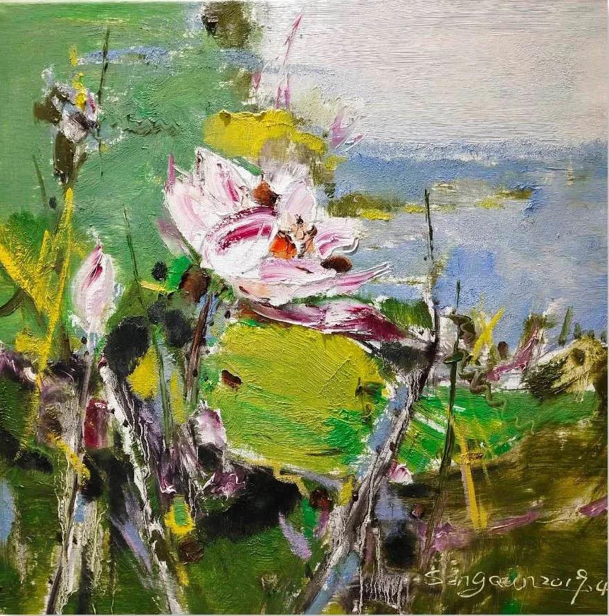 当村庄与山峦融入画面,当一抹抹色彩一笔笔线条一道道笔痕建立在画布之上,你已是它的主人了。把自己融入其中,在广袤的田野,在清幽的云水之间。这时候才明白什么是真正的风景,什么是源于生活且高于生活的风景,什么是主观的东西,什么是意向的风景。才明白风景与照片之间的差距与距离。才呼吸到了什么是真正的泥土味道。才知道手中的画笔,是无法把自然之美表现的完美。