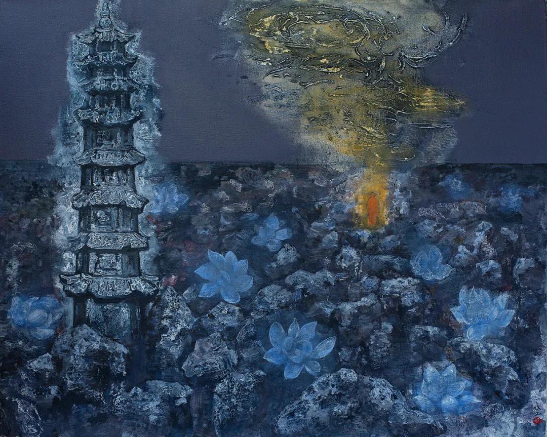 过去和现在,我可以想象李江先生在乐山的“沃土”中一面于现实的生活中挣扎,一面在精神的世界里“涂抹”,乐山独特的地域文化和“禅意”理念也必然影响他的个人情感。他以油画为媒介,从“飞石系列”到“禅意系列”,个性的色彩和极具禅意的“佛像”“莲花”等元素符号在画面中反复叠置,让人联想到自然万物幻灭幻生的规律。“那些巨大的陨石燃烧着从太空砸向大地,那种张力,那种速度,那种不明来历的物质从天而降,从我们的头顶飞过,灾难似乎就在转瞬之间。”有朋友这样阐释李江的作品。在我看来,看画就是在读“自己”的内心,原来“自己”的心并没有被年复一年,日复一日,一成不变,令人窒息的生活所扼杀。突然觉得,李江先生和我原来都没有片刻忘记人性里对善意和美好的追求......