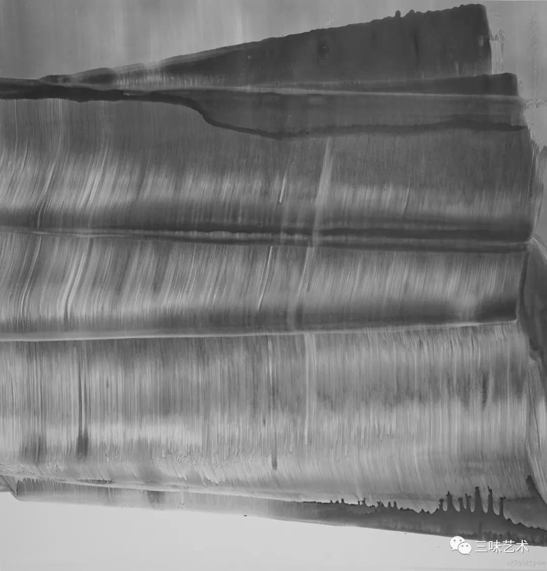 有意思的是,2011年以后,吴国全再次回到了自己创作的原初起点与逻辑关系之中。资料显示,他此后既创作了《图片水墨》系列,也创作了《硬质水墨》系列;既创作了《砸墨》系列,也创作了《狂草水墨》系列。与他过去的水墨创作相比,很明显的是,这些不同系列的作品已经偏离了他先前的表现主义创作路线,并且是在往抽象表现的路子上转。另外,吴国全在这些不同系列的思考方面其实有着很大区别,这也显示出他想不断摸索新创作方向,以获得学术界与收藏界更大程度认可的强烈愿望。比如,《图片水墨》系列在强调“水墨思维与点、线、面、光的交响”时,意在突出现代影像与水墨表现的结合;(图五,选发《图片水墨》系列中的作品)《硬质水墨》系列在使用新的材料——硬纸与排刷时,意在突出运墨过程中所形成的不同矩形图式与肌理关系;(图六,选发《硬质水墨》系列中的作品)而《砸墨》系列则是将水墨表现与行为艺术结合了起来,其方法是将墨汁包好后再砸开,这也使得他能够在大纸、大布、大墙、大地、大木板等媒介上随意作画,进而追求所谓“表达方式的革命”。(图七,选发《砸墨》系列中的作品)不过,我对于后者,即《狂草水墨》系列更感兴趣。因为其不但将传统书法或水墨的元素融入了具有象征意味的抽象结构之中,而且特别注意对瞬间暴发情感的表达,结果便给人以完全不同于传统书法与西方抽象画的特殊感受。在国内一些抽象水墨艺术家为了学习西方抽象艺术家的画面图式与表现手法,不惜消解笔墨表现,转而运用大泼大染大制作之手法的背景下,他的相关探索十分具有意义。(图八,选发《狂草水墨》系列中的作品)